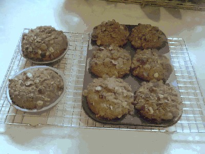 Na zdjęciu ciasto w formie muffinek (wyszło mi 8 dość sporych). Piekłam ok 25-30 minut. Wolę jednak wersję "ciastową", bo mieści się w niej więcej kruszonki (przy produkcji muffinek została mi niewykorzystana kruszonka), a ta część dodana do środka tworzy taką lepką, karmelową w smaku masę.