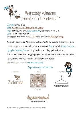 Moi drodzy, z ogromną przyjemnością informuję, że już 23 lutego warsztaty "Gotuj z Ciocią Zieleniną" zawitają do Krakowa do MAMY CAFE :) Można się już zapisywać, wszystkie szczegóły poniżej, zapraszamy!
