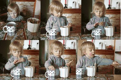 Jedyna zabawa, która się sprawdza koncertowo, jest (po uprzednim przypięciu w krzesełku) przelewanie wody łyżką wazową w różne pojemniki, lejki, rozchlapywanie na boki, siorbanie jej ze stolika. Poza tym NIC. Ale nie poddaję się! |