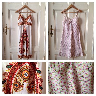 Sukienki, każda po 15 pln, po lewej z lejącego materiału M, po prawej bawełna S
