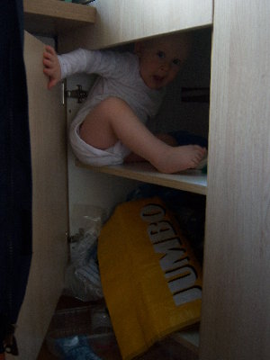 zojanka, my w sumie też zabezpieczyliśmy tylko gniazdka, mamy takie z ikei hxxp://www.ikea.com/pl/pl/catalog/products/60098961/ Kupiliśmy też takie zabezpieczenia na szafki: hxxp://www.ikea.com/pl/pl/catalog/products/90278098/ ale się nie sprawdziły, bo za bardzo wkurza otwieranie;) więc środki czystości i inne potencjalnie niebezpieczne przedmioty powędrowały poprostu na górne półki, we wszystkich dolnych Chomi może szperać do woli, swojego czasu to była jego ulubiona zabawa - właziłć do jednej z szafek w kuchni i wywalać z niej zawartość - foto w załączniku ;) Jeszcze mamy zabezpieczoną kuwetę kota ale DYI czyli poprostu wsadziliśmy ją do wielkiego kartona, żeby nie kusiła za bardzo z zewnątrz. A jeśli chodzi o śmietnik, to Staś już sam do niego wyrzuca papierki, więc nie jest zabezpieczony ;-) Czasem chce coś wygrzebać z niego w zamian, no ale po prostu go wtedy pilnuję. Za to polecam stary dobry sposób mojej teściowej na zamknięcie szafek - czyli założenie gumek recepturek między dwoma uchwytami ;) koszt minimalny.