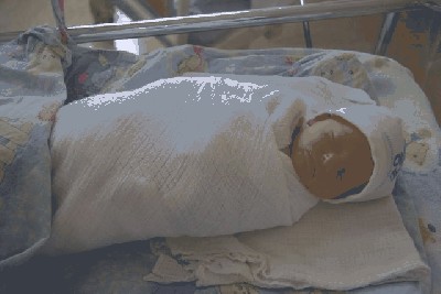 To ja może pokażę swoją mumię,a na to wszystko jeszcze becik A pod tetrą chyba koszulka jeszcze. Tak robią,bo to wygoda dla personelu - nie trzeba ubierać, łatwo podnieść - podnoszą dzieci jak pakunek za to wiązanie,ale nie ma co się dziwić, na Kopernika w Krakowie czas się zatrzymał 30 lat temu