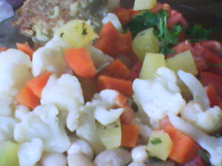 wczesny obiad, fasolka, z pomidorem i kalafiorem, marchewka i cukinia, na parze posypane natka pietruszki kotlet z kalafiora