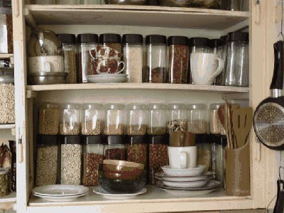 Tasaku- możesz kupić sobie słoiki, ja kupowałam takie używane po kawie, na all po 1 zł za sztukę :) . Do tego regał z obi drewniany za 29-40 zł i Masz spiżarkę słoikową, nawet w przedpokoju, na regał zasłonka z lumpa, koronka, czy roletka z bambusa i git! (No jeszcze zawartość słoików kosztuje, ale to z czasem można dosypać, pomalutku...).