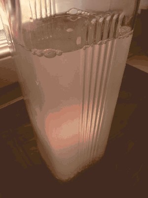 Pierwszą wodę z dzbanka wypijam na drugi dzień i za każdą szklaneczkę odjętą uzupełniam zwykłą wodą. I tak po około 3 dniach na górze zaczyna zbierać się "pianka" a z dołu lecą bąbelki tlenu a kwas staje się biały jak Ouzo z wodą, ana dole między ziarenkami zbiera się osad, jakby "mąka" - zostawiam to na dnie cały czas, czasem zabełtam dzbankiem po dolaniu wody.