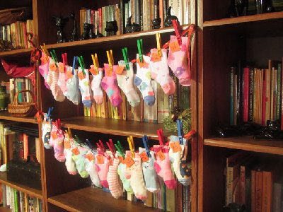 Ha! a u mnie właśnie wisi bardzo podobny, tylko zamiast skarpet są kolorowe woreczki. Boże Narodzenie nas nie dotyczy, więc zaadaptowałam pomysł kalendarzowy do bliższych nam okoliczności urozmaicając dzieciakom w ten sposób miesiąc Kartika (taki szczególny dla krysznaitów czas w roku). Przed nami ostatnie 5 dni, a więc ostatnie 5 woreczków. Ale frajda była/jest ogromna :-D
