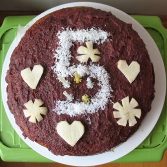Posmarowałam powidłami. Zrobiłam ozdobę z wiórków kokosowych. Wstawiłam do lodówki. Rano dorobiłam ozdobę z surowego jabłka, które było uprzejme nie ściemnieć na torcie.