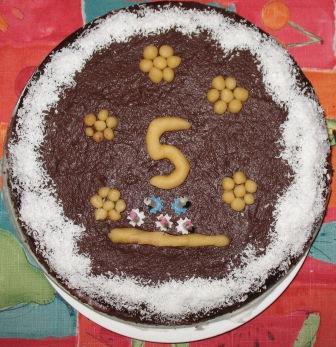 Dzisiaj był tort czekoladowy (przepis jak wyżej, dodałam jeszcze 4 łyżki kakao) z masą wiśniowo-kokosową (wiśnie z kompotu od babci, czyli z cukrem, mleko kokosowe, agar) i polewą czekoladową (daktyle i gorzka czekolada). Na wierzchu wiórki kokosowe i ozdoby z marcepanu na miodzie. Tort pyszny, dla mnie ciut za słodki. Masę następnym razem zrobię z samych wiśni, będzie dobry kontrast dla ciasta. Ciasto wyszło mi z lekka zakalcowate, sporo opadło po upieczeniu, ale nie było widać ani czuć. Masa na ciasto wyszła rzadsza niż na ten poprzedni tort, mimo że dodałam kakao. Nie wiem, dlaczego tak się stało. Ale już wiem, że ciasto było trochę za rzadkie i pewno stąd lekki zakalec. Został kawałek, jutro zrobię fotkę.