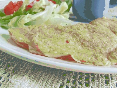 Po przełożeniu na drugą stronę obkładamy je serem i pomidorami, składamy na pół i smażymy aż ser się rozpuści. Podajemy z sosem, u mnie był to naturalny jogurt doprawiony tylko solą i pieprzem.