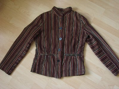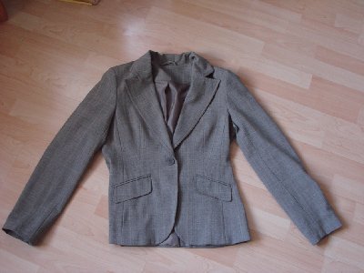 Marynarka w delikatną krateczkę. Wymiary: szer. pod pachami 46cm; szer. na wysokości guzika 40cm; dł. 61cm; dł. rękawów od ramienia 62cm. Cena 12zł