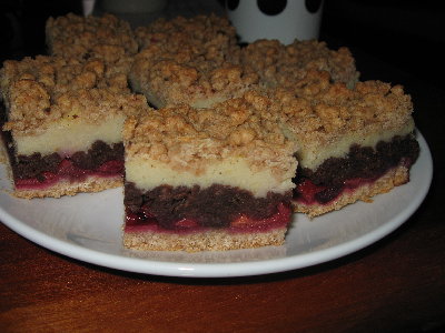 Wyjmuje z lodówki jasną część, ścieram na dużych oczkach. Spód podpiekam 5-7 minut. Po tym czasie wyjmuję blachę, spód smaruje dżemem (tym razem zamiast dżemu użyłam wiśni), dobry jest porzeczkowy np. lub jakiś inny kwaskowy. Na to ścieram ciemną część i znowu na kilka minut do piekarnika. Na koniec nakładam budyń (najlepiej żeby był ciepły, lepiej rozsmarować) na to ścieram jasną część.