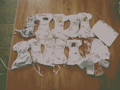 - pieluszki flanelowe, uszyte przeze mnie z kieszonką zawiązywane na sznureczki - 10 sztuk